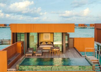 Everything surprised us about Kagi Maldives, a speck of a resort (just 50 overwater villas) set smack dab in the middle of the Indian Ocean. From the moment we touched down on the floating platform in the sea (where the seaplane landed to unload guests) to the Baani Spa (which means “ocean swell” in the local Dhivehi language), designed by a prominent Japanese architect to look like a curvy wave, we were enthralled. Full disclosure: while we originally came for the resort (the overwater bungalows, snorkeling, and swimming off the laddered deck of our villa), we stayed — and would return again and again — for the spa. Treatments include lymphatic and abdominal massage, Balinese and Thai modalities, sound healing, meditation, and sunrise/sunset yoga (in the water).